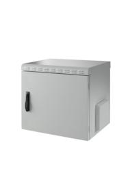 Des entrées d’air sont présentes à gauche et à droite du coffret pour assurer une ventilation passive. Le toit à charnières permet l’installation d’un ventilateur. Le fond du coffret dispose d’un presse étoupe et de passe fils aveugles en PVC.